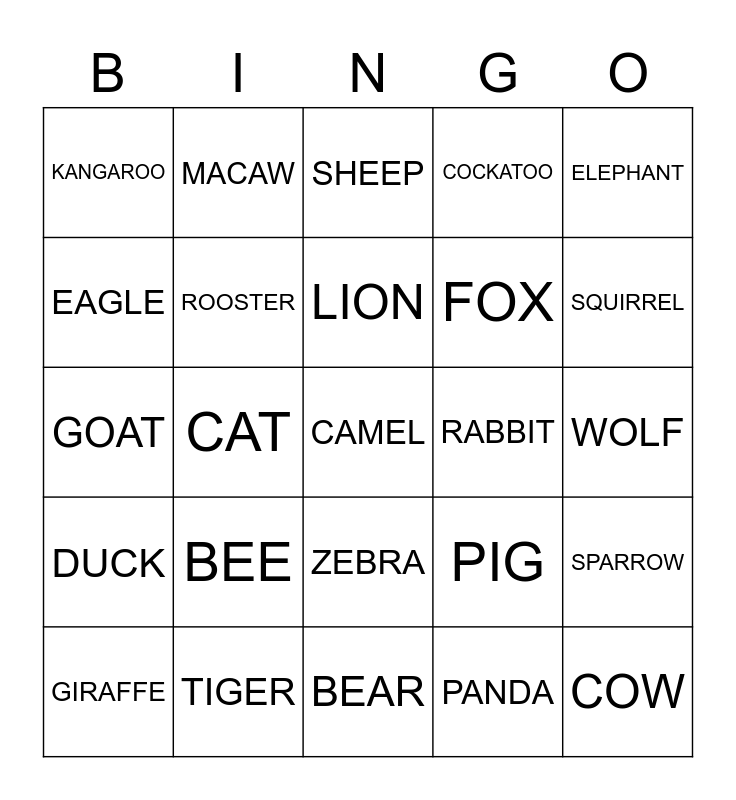 This bingo card has 33 words: COW, HORSE, CAT, GORILLA, DUCK, ROOSTER, ELEPHANT, GIRAFFE, MACAW, STORK, LION, SHEEP, HEN, MOSQUITO, RABBIT, SQUIRREL, TIGER, GOAT, BEE, PIG, ZEBRA, ANTELOPE, KANGAROO, WOLF, BEAR, CAMEL, COCKATOO, FOX, EAGLE, SPARROW, OWL, PANDA and DONKEY.