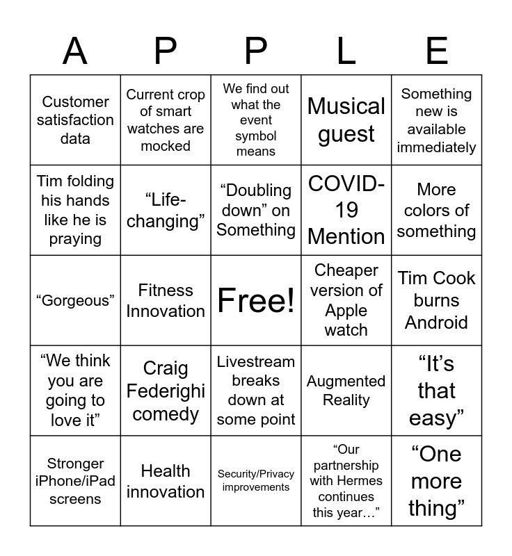 This bingo card has a free space and 25 words: Craig Federighi comedy, Security/Privacy improvements, “Doubling down” on Something, Stronger iPhone/iPad screens, Something new is available immediately, Customer satisfaction data, Tim folding his hands like he is praying, Current crop of smart watches are mocked, Cheaper version of Apple watch, Livestream breaks down at some point, COVID-19 Mention, “Gorgeous”, Augmented Reality, “It’s that easy”, “Life-changing”, Apple One bundle launch, Tim Cook burns Android, We find out what the event symbol means, More colors of something, Fitness Innovation, “One more thing”, Health innovation, “We think you are going to love it”, Musical guest and “Our partnership with Hermes continues this year…”.