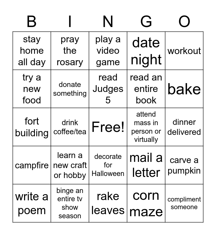 This bingo card has a free space and 24 words: write a poem, learn a new craft or hobby, read Judges 5, corn maze, workout, stay home all day, pray the rosary, play a video game, attend mass in person or virtually, dinner delivered, fort building, donate something, mail a letter, carve a pumpkin, try a new food, binge an entire tv show season, rake leaves, date night, bake, campfire, drink coffee/tea, decorate for Halloween, read an entire book and compliment someone.
