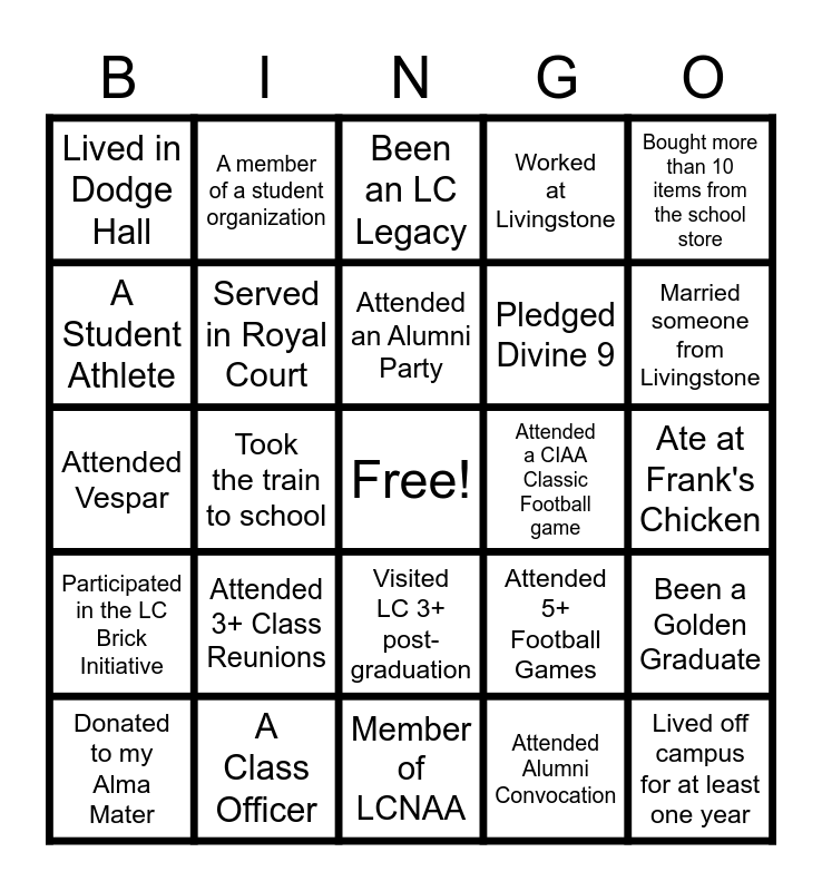 This bingo card has a free space and 24 words: Attended 3+ Class Reunions, A Class Officer, Attended an Alumni Party, Donated to my Alma Mater, Bought more than 10 items from the school store, Lived in Dodge Hall, A Student Athlete, A member of a student organization, Attended a CIAA Classic Football game, Visited LC 3+ post-graduation, Pledged Divine 9, Attended Vespar, Attended 5+ Football Games, Been a Golden Graduate, Served in Royal Court, Attended Alumni Convocation, Ate at Frank's Chicken, Been an LC Legacy, Married someone from Livingstone, Took the train to school, Lived off campus for at least one year, Participated in the LC Brick Initiative, Worked at Livingstone and Member of LCNAA.