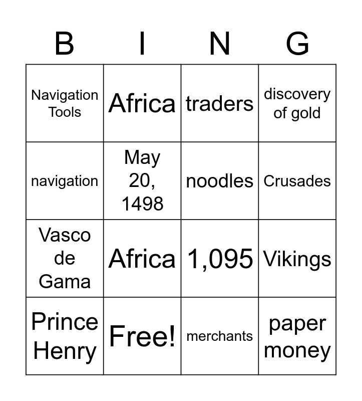 This bingo card has 16 words: Free!, Vikings, traders, Navigation Tools, Vasco de Gama, Africa, 1,095, merchants, navigation, May 20, 1498, Prince Henry, discovery of gold, Africa, Crusades, noodles and paper money.