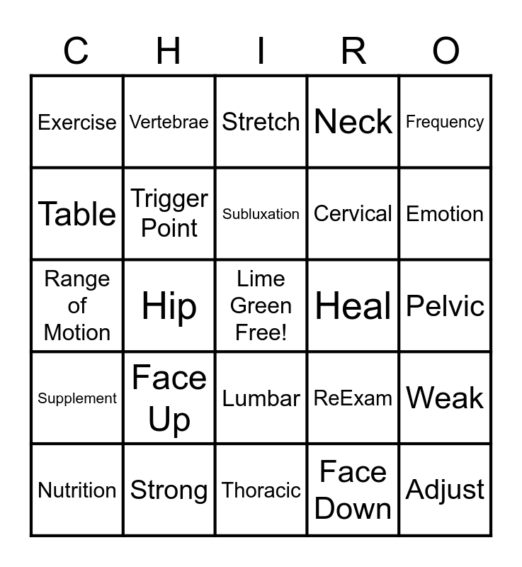 This bingo card has a free space and 24 words: Face Up, Strong, Subluxation, Nutrition, Frequency, Exercise, Table, Vertebrae, Heal, Lumbar, Cervical, Range of Motion, ReExam, Weak, Trigger Point, Face Down, Pelvic, Stretch, Emotion, Hip, Adjust, Supplement, Neck and Thoracic.