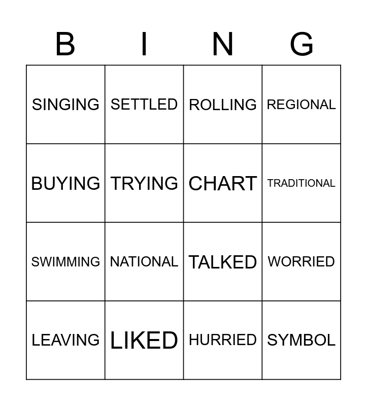 This bingo card has 16 words: LIKED, WORRIED, ROLLING, SINGING, SWIMMING, SETTLED, TALKED, HURRIED, BUYING, TRYING, LEAVING, REGIONAL, NATIONAL, TRADITIONAL, CHART and SYMBOL.