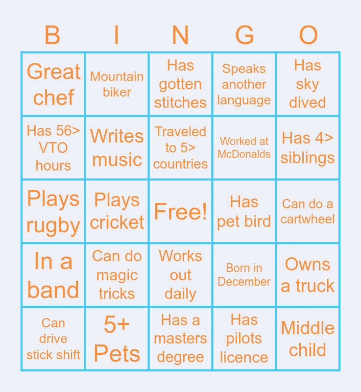 This bingo card has a free space and 59 words: 4+ children, 5+ Pets, Plays an instrument, In a band, Has pilots licence, Great dancer, Writes music, Writes poetry, Worked at McDonalds, Learned new skill during quarantine, Speaks another language, Speaks 3> languages, Has 56> VTO hours, Trailhead Ranger, Works on cars, Great chef, Middle child, Has sky dived, Youngest child, Traveled to 5> countries, Has pet bird, Has gotten stitches, Can drive stick shift, Owns a truck, Never lived outside TX, Grew up on a farm, Is a twin, Takes cruise ship vacations, Has 4> siblings, Rock climber, Owns a boat, Can water ski, Plays tennis, Road cyclist, Mountain biker, Kayaks, Snow skier, Plays cricket, Volleyball player, Plays rugby, Plays golf, Can do magic tricks, Can do a cartwheel, Can do the splits, Has been a waiter/waitress, Doesn't like chocolate, Doesn't like pizza, Has baby under 1 year, Works out daily, Has a masters degree, Has a PhD, Ran a marathon, Has done a triathlon, Loves to paint, Wore braces, Born in December, Dislikes country music, Loves country music and Loves Jazz music.