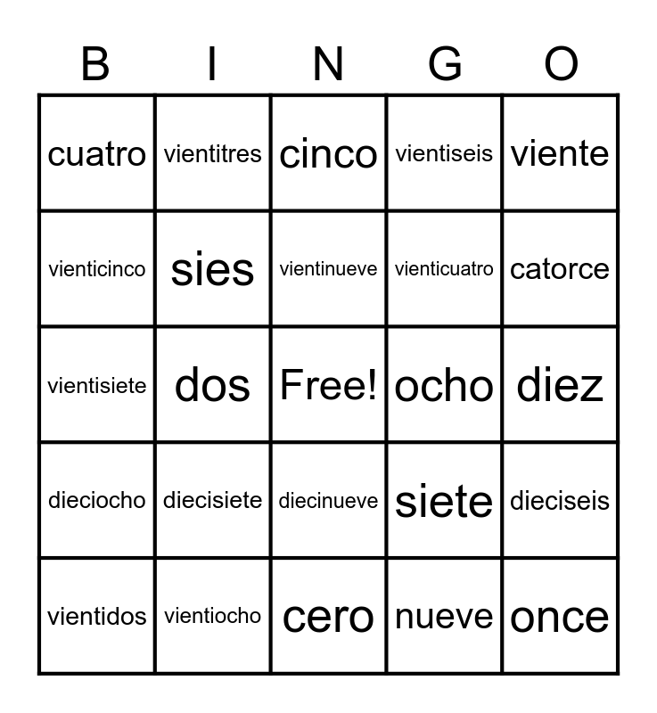This bingo card has a free space and 31 words: cero, uno, dos, tres, cuatro, cinco, sies, siete, ocho, nueve, diez, once, doce, trece, catorce, quince, dieciseis, diecisiete, dieciocho, diecinueve, viente, vientiuno, vientidos, vientitres, vienticuatro, vienticinco, vientiseis, vientisiete, vientiocho, vientinueve and trenta.