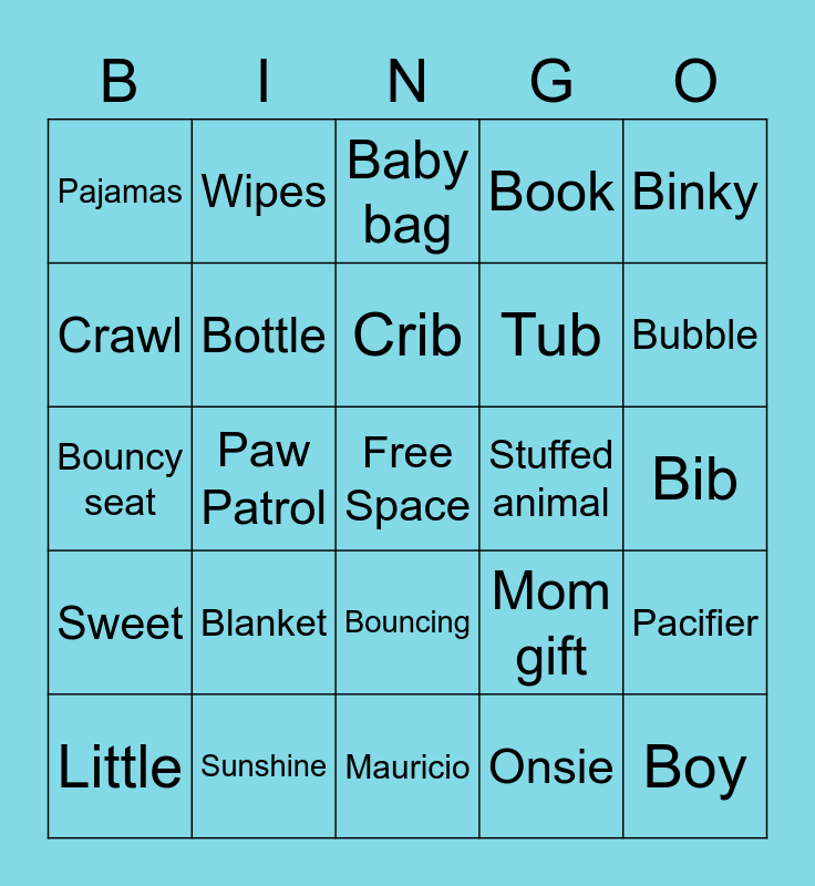 This bingo card has a free space and 48 words: Baby, Boy, Ceci, Mauricio, Blanket, Blue, Wipes, Swaddle, Crawl, Diaper, Bottle, Book, Pacifier, Mom gift, Sneakers, Burp cloth, Crib, Stuffed animal, Toys, Binky, Paw Patrol, Onsie, Pajamas, Tub, Laugh, Bubble, Little, Play, Bouncing, Sweet, Daddy, Mommy, Teething, Goodnight, Sunshine, Night light, Smiles, Bib, Swing, High Chair, Stroller, Car seat, Baby bag, Bottle warmer, Bouncy seat, Rattle, Sleeper and Hat.