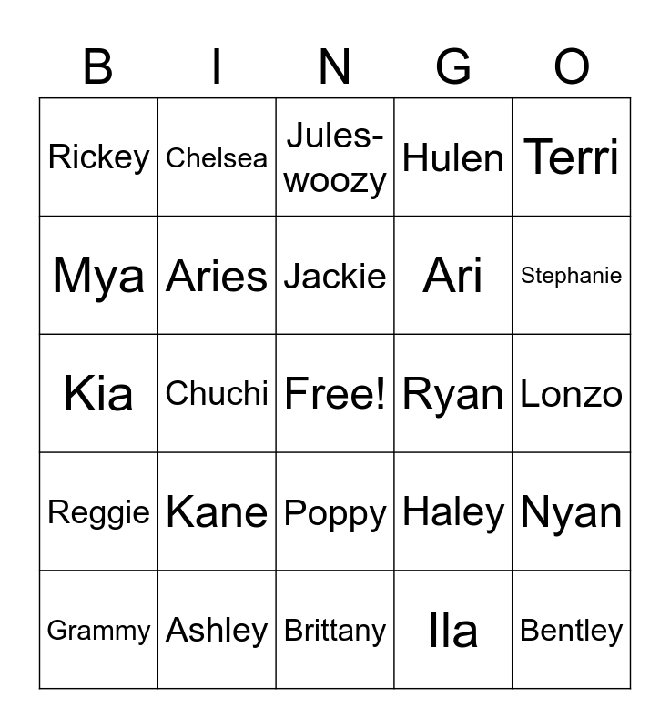 This bingo card has a free space and 24 words: Grammy, Kane, Jackie, Ila, Terri, Rickey, Chelsea, Jules-woozy, Ryan, Lonzo, Kia, Aries, Haley, Nyan, Mya, Ashley, Brittany, Hulen, Stephanie, Reggie, Chuchi, Poppy, Ari and Bentley.