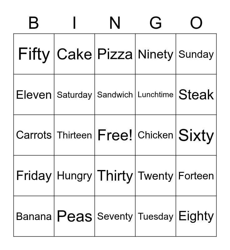 This bingo card has a free space and 34 words: Monday, Tuesday, Wednesday, Thursday, Friday, Saturday, Sunday, Banana, Cake, Cheese, Sandwich, Pizza, Apple, Sausage, Chicken, Steak, Peas, Carrots, Hungry, Twenty, Thirty, Forty, Fifty, Sixty, Seventy, Eighty, Ninety, Ten, Lunchtime, Eleven, Twelve, Thirteen, Forteen and Fifteen.