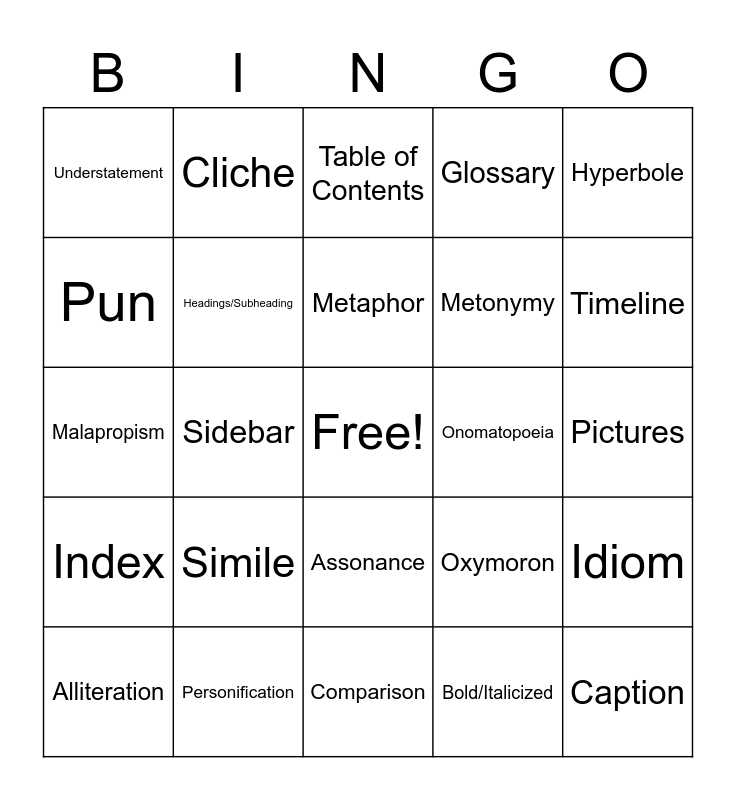 This bingo card has a free space and 24 words: Simile, Personification, Metaphor, Alliteration, Hyperbole, Understatement, Pun, Cliche, Onomatopoeia, Assonance, Metonymy, Malapropism, Oxymoron, Idiom, Headings/Subheading, Bold/Italicized, Pictures, Table of Contents, Timeline, Sidebar, Caption, Index, Glossary and Comparison.