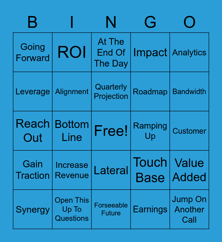 This bingo card has a free space and 24 words: Increase Revenue, Open This Up To Questions, Quarterly Projection, Synergy, Analytics, Going Forward, Leverage, ROI, Ramping Up, Lateral, Roadmap, Reach Out, Touch Base, Value Added, Alignment, Earnings, Customer, At The End Of The Day, Bandwidth, Bottom Line, Jump On Another Call, Gain Traction, Impact and Forseeable Future.