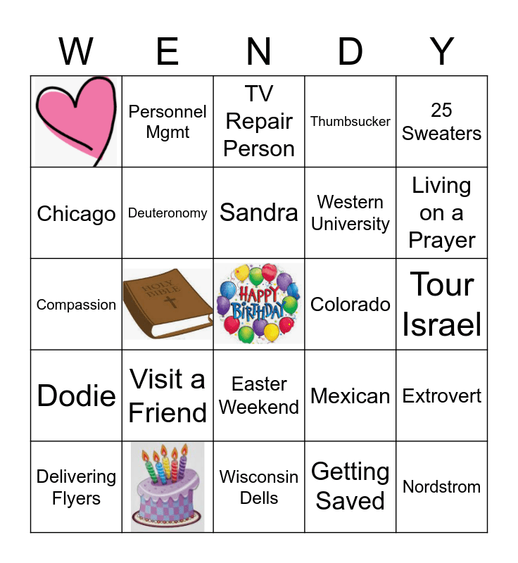 This bingo card has 5 images, a free space and 25 words: TV Repair Person, Deuteronomy, Easter Weekend, Colorado, Wisconsin Dells, Tour Israel, Nordstrom, Getting Saved, I Still Believe, Living on a Prayer, Air1, Mexican, Dodie, Visit a Friend, 25 Sweaters, Compassion, Christian, Personnel Mgmt, Western University, Chicago, Thumbsucker, Extrovert, Delivering Flyers, Sandra and Forgiveness.