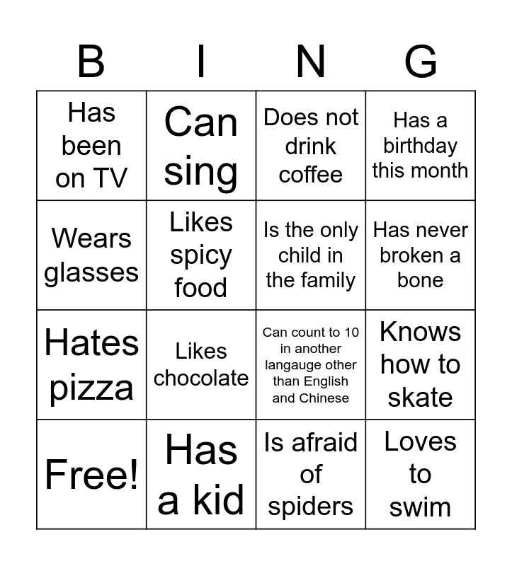 This bingo card has 16 words: Has a kid, Knows how to skate, Does not drink coffee, Has been on TV, Hates pizza, Can sing, Can count to 10 in another langauge other than English and Chinese, Is afraid of spiders, Wears glasses, Likes spicy food, Free!, Has a birthday this month, Likes chocolate, Has never broken a bone, Is the only child in the family and Loves to swim.