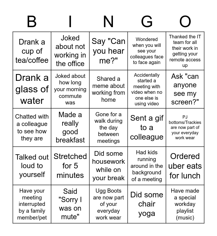 This bingo card has a free space and 24 words: Stretched for 5 minutes, Said "Sorry I was on mute", Shared a meme about working from home, Have your meeting interrupted by a family member/pet, Thanked the IT team for all their work in getting your remote access up, Drank a cup of tea/coffee, Drank a glass of water, Joked about not working in the office, Sent a gif to a colleague, Did some housework while on your break, Accidentally started a meeting with video when no one else is using video, Chatted with a colleague to see how they are, Had kids running around in the background of a meeting, Ordered uber eats for lunch, Joked about how long your morning commute was, Did some chair yoga, PJ bottoms/Trackies are now part of your everyday work wear, Say "Can you hear me?", Ask "can anyone see my screen?", Made a really good breakfast, Have made a special workday playlist (music), Talked out loud to yourself, Wondered when you will see your colleagues face to face again and Ugg Boots are now part of your everyday work wear.