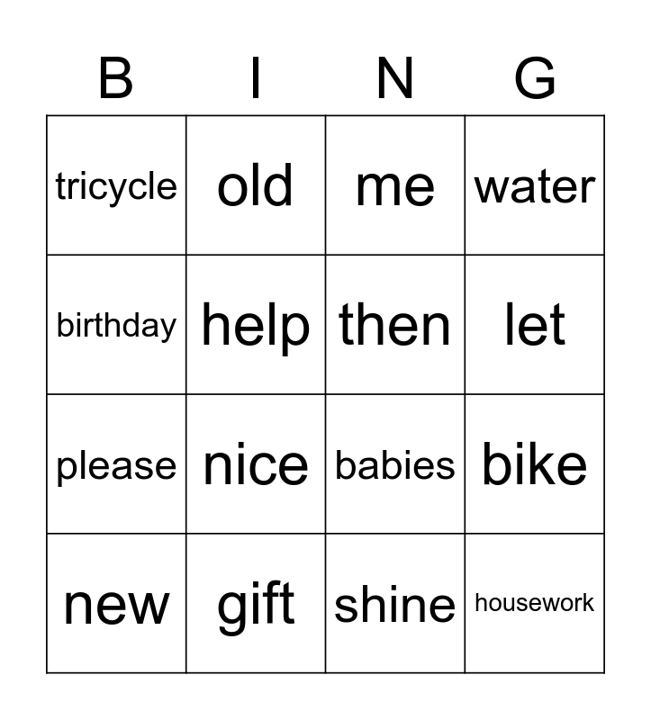 This bingo card has 20 words: bike, ride, me, my, new, birthday, gift, tricycle, please, old, nice, babies, help, housework, then, clean up, let, water, shine and yours.