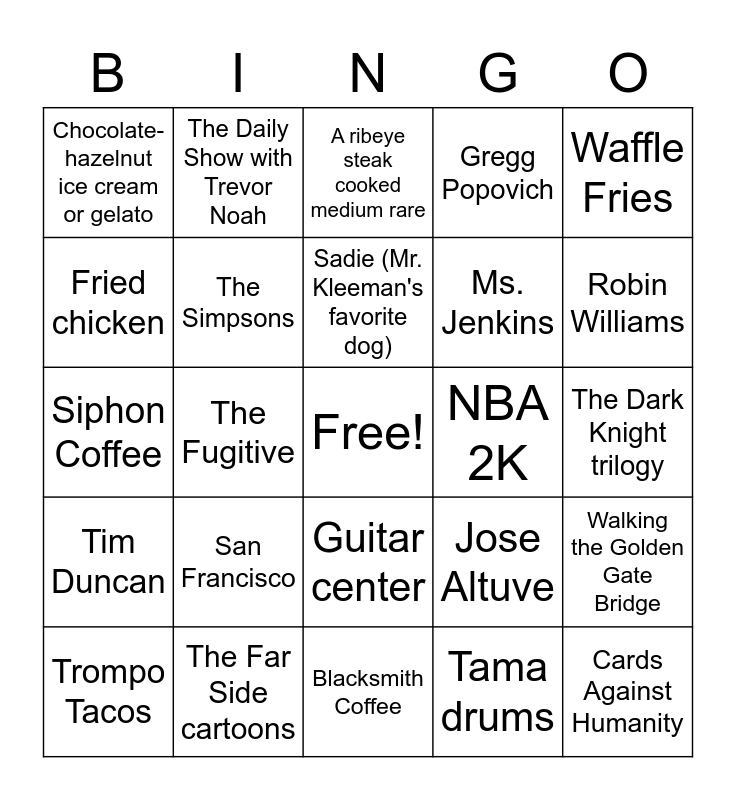 This bingo card has a free space and 84 words: San Antonio Spurs, The Salt Lick BBQ, A ribeye steak cooked medium rare, Houston Astros, The Beatles, New York City, Pluckers Trivia Shepherd, Houston Rockets, Paris, Franklin BBQ, SCP-3008, Nirvana, The Simpsons, NBA 2K, Nutella, Chocolate-hazelnut ice cream or gelato, Trompo Tacos, Fried chicken, Willie Mae's Scotch House, Raising Cane's, Stephen King books, Ms. Jenkins, Cards Against Humanity, Poetry, The Fugitive, Independence Day (the movie), Perry's Steakhouse famous pork chop, You (his students), El Tiempo filet fajitas, Mala Sichuan Bistro, San Francisco, Antidote and Black Hole coffee houses, Javaman Coffee, Siphon Coffee, Hugo's, Backstreet Cafe, Blacksmith Coffee, Honda Accord, Robin Williams, Tim Duncan, Manu Ginobili, Tony Parker, James Harden, Hakeem Olajuwon, Tour de France, Last Week Tonight with John Oliver, The Daily Show with Trevor Noah, U2, Rock concerts so loud I can't hear correctly for a week, Cold brew with cream, Ferrero Rocher, Jose Altuve, Gregg Popovich, Katherine Smith Elementary, The color black, Bad puns, The Far Side cartoons, Sadie (Mr. Kleeman's favorite dog), Wii Sports bowling, The Dark Knight trilogy, Popcorn loaded with melted butter, Bebop jazz, Miles Davis, Tom Hanks, Denzel Washington, Leonardo DiCaprio, Newspapers, Little Jimmy's Deli, Waffle Fries, Long walks on the beach, Walking the Golden Gate Bridge, Darwin award winners, Foreign language films, Spurs HEB Commercials, Guitar center, Tama drums, Taco Tuesday at Tacos A Go-Go, The Empire State Building observation deck at night, Clocks by Coldplay, Songs in A-flat, Bill Nye The Science Guy, 94.5 The Buzz, Hermann Park and The IT Crowd.