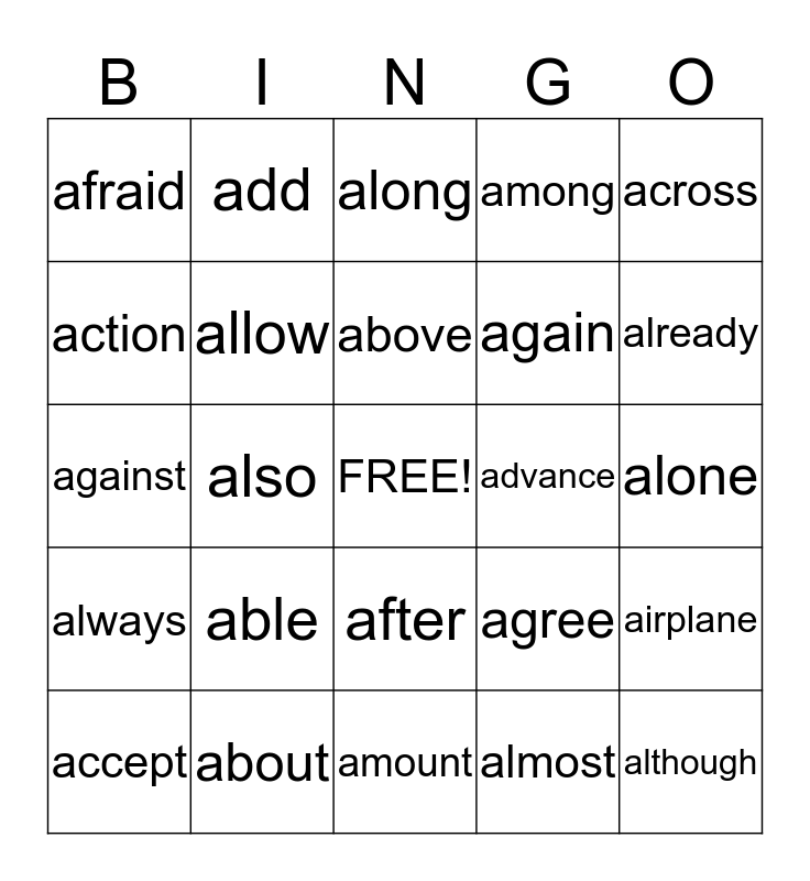 This bingo card has a free space and 24 words: able, about, above, accept, across, afraid, action, add, advance, after, again, against, agree, airplane, allow, almost, alone, along, already, also, although, always, among and amount.