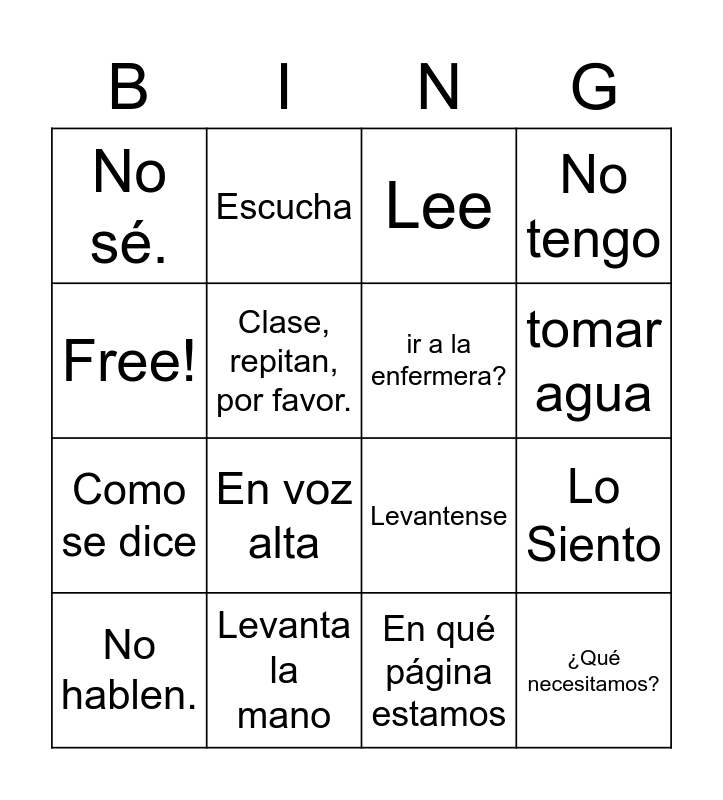 This bingo card has 16 words: Levanta la mano, Lo Siento, Lee, No sé., Como se dice, Escucha, Levantense, En qué página estamos, Free!, Clase, repitan, por favor., No hablen., No tengo, En voz alta, tomar agua, ir a la enfermera? and ¿Qué necesitamos?.