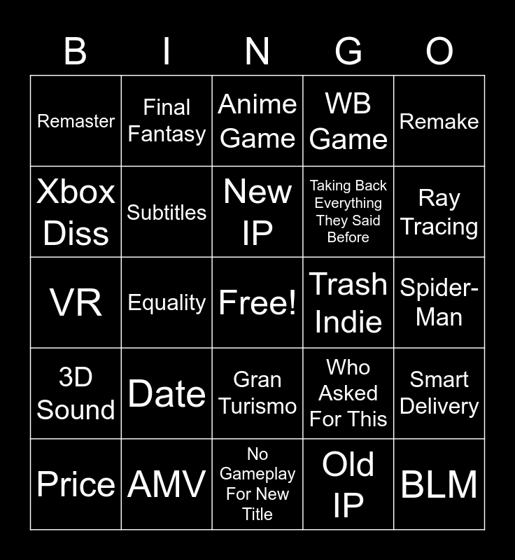 This bingo card has a free space and 24 words: Price, Date, New IP, Old IP, Remake, Remaster, Final Fantasy, Anime Game, Trash Indie, Spider-Man, VR, Subtitles, Who Asked For This, Smart Delivery, Xbox Diss, AMV, No Gameplay For New Title, WB Game, Ray Tracing, 3D Sound, Equality, Gran Turismo, Taking Back Everything They Said Before and BLM.