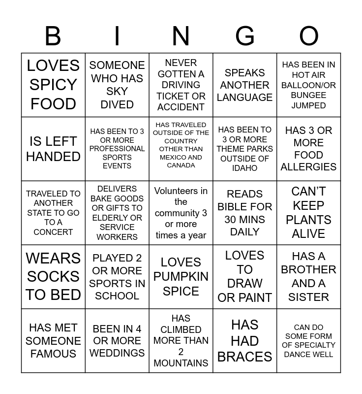 This bingo card has a free space and 29 words: WRITES HAND WRITTEN LETTERS FREQUENTLY, BEEN IN 4 OR MORE WEDDINGS, NEVER GOTTEN A DRIVING TICKET OR ACCIDENT, HAS NEVER OWNED A SMART PHONE, HAS BEEN IN HOT AIR BALLOON/OR BUNGEE JUMPED, LOVES SPICY FOOD, HAS BEEN TO 3 OR MORE PROFESSIONAL SPORTS EVENTS, HAS TRAVELED OUTSIDE OF THE COUNTRY OTHER THAN MEXICO AND CANADA, READS BIBLE FOR 30 MINS DAILY, HAS A BROTHER AND A SISTER, HAS MET SOMEONE FAMOUS, DELIVERS BAKE GOODS OR GIFTS TO ELDERLY OR SERVICE WORKERS, HAS HAD BRACES, CAN DO SOME FORM OF SPECIALTY DANCE WELL, TRAVELED TO ANOTHER STATE TO GO TO A CONCERT, HAS BEEN ON A CRUISE, HAS CLIMBED MORE THAN 2 MOUNTAINS, LOVES TO DRAW OR PAINT, HAS 3 OR MORE FOOD ALLERGIES, WEARS SOCKS TO BED, PLAYED 2 OR MORE SPORTS IN SCHOOL, HAS NEVER BROKEN A BONE, HAS BEEN TO 3 OR MORE THEME PARKS OUTSIDE OF IDAHO, CAN’T KEEP PLANTS ALIVE, IS LEFT HANDED, SOMEONE WHO HAS SKY DIVED, LOVES PUMPKIN SPICE, SPEAKS ANOTHER LANGUAGE and IS SUPER ORGANIZED AND NEAT FREAK.