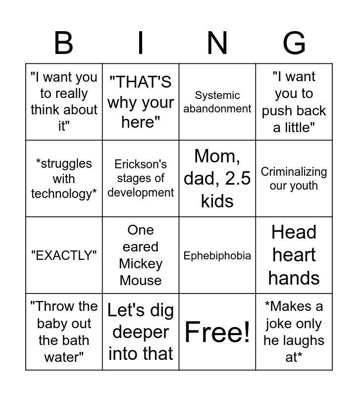This bingo card has 17 words: Free!, "Throw the baby out the bath water", Systemic abandonment, "I want you to really think about it", One eared Mickey Mouse, "I want you to push back a little", Head heart hands, Mom, dad, 2.5 kids, Criminalizing our youth, Erickson's stages of development, Let's dig deeper into that, Ephebiphobia, *struggles with technology*, "THAT'S why your here", "EXACTLY", *Plugs his doctoral work/his book* and *Makes a joke only he laughs at*.