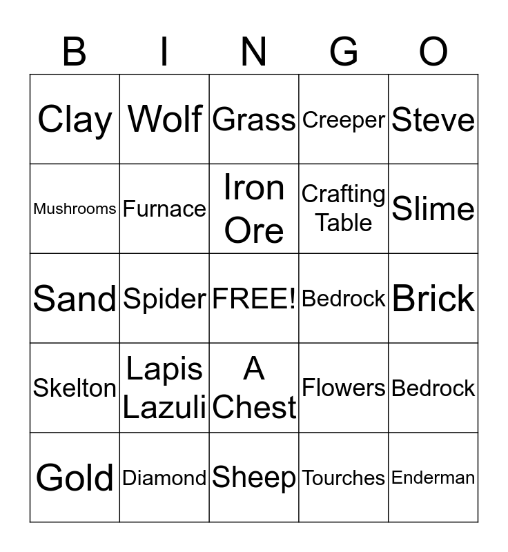 This bingo card has a free space and 24 words: Lapis Lazuli, Diamond, Iron Ore, Gold, Steve, Clay, Mushrooms, Wolf, Bedrock, A Chest, Crafting Table, Sand, Flowers, Bedrock, Furnace, Tourches, Brick, Grass, Slime, Spider, Enderman, Skelton, Creeper and Sheep.