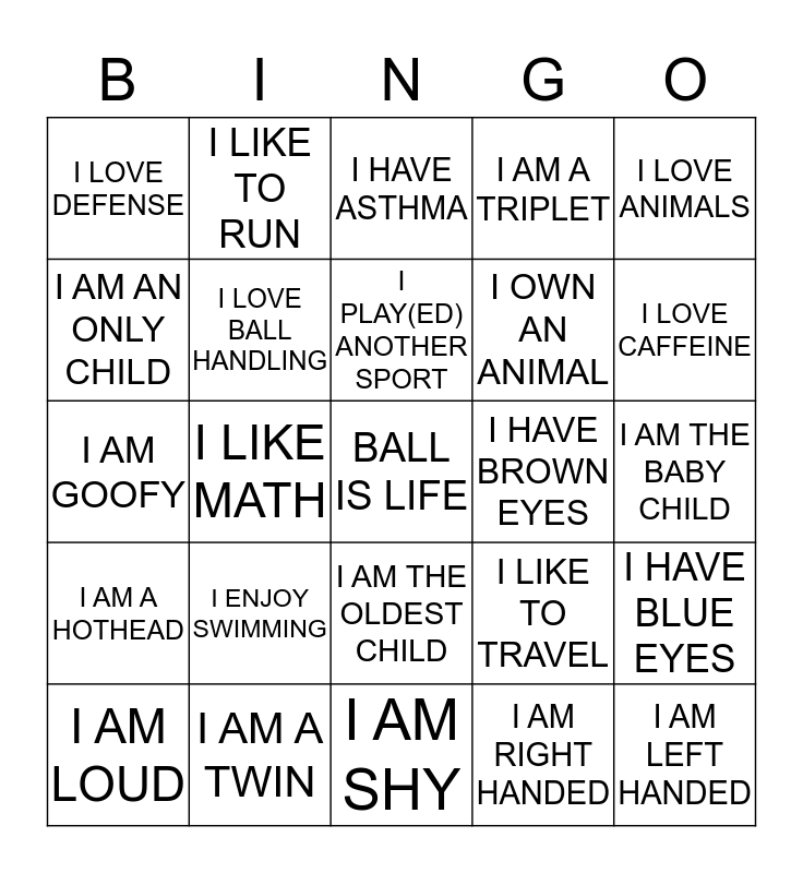 This bingo card has a free space and 24 words: I ENJOY SWIMMING, I AM A TWIN, I PLAY(ED) ANOTHER SPORT, I AM LOUD, I LOVE ANIMALS, I LOVE DEFENSE, I AM AN ONLY CHILD, I LIKE TO RUN, I HAVE BROWN EYES, I AM THE OLDEST CHILD, I OWN AN ANIMAL, I AM GOOFY, I LIKE TO TRAVEL, I HAVE BLUE EYES, I LOVE BALL HANDLING, I AM RIGHT HANDED, I AM THE BABY CHILD, I HAVE ASTHMA, I LOVE CAFFEINE, I LIKE MATH, I AM LEFT HANDED, I AM A HOTHEAD, I AM A TRIPLET and I AM SHY.