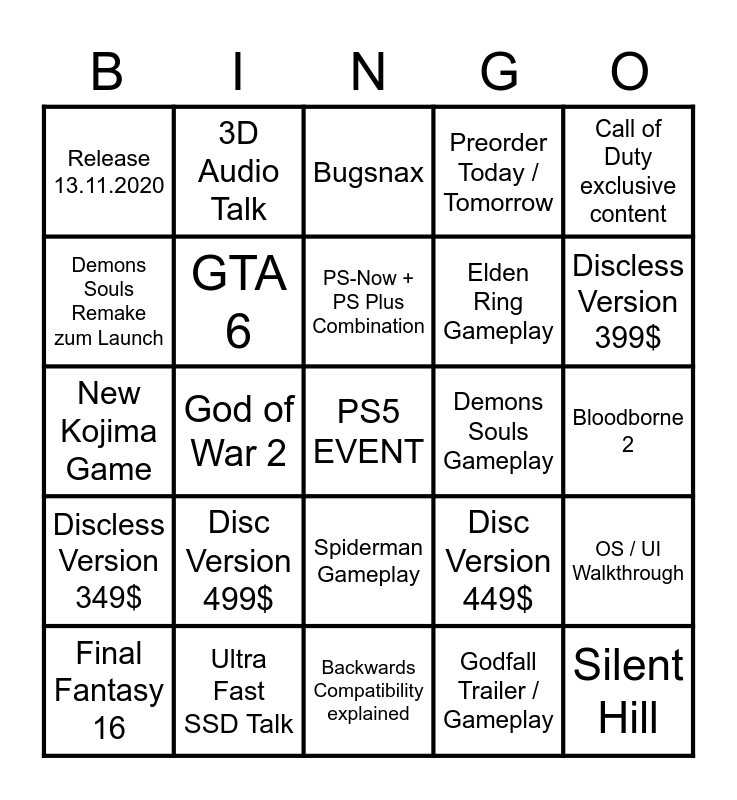 This bingo card has a free space and 24 words: Disc Version 499$, Ultra Fast SSD Talk, PS-Now + PS Plus Combination, Final Fantasy 16, Call of Duty exclusive content, Release 13.11.2020, Demons Souls Remake zum Launch, 3D Audio Talk, Demons Souls Gameplay, Spiderman Gameplay, Elden Ring Gameplay, New Kojima Game, Disc Version 449$, OS / UI Walkthrough, GTA 6, Godfall Trailer / Gameplay, Bloodborne 2, Bugsnax, Discless Version 399$, God of War 2, Silent Hill, Discless Version 349$, Preorder Today / Tomorrow and Backwards Compatibility explained.