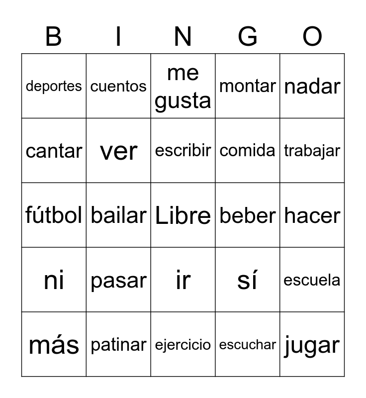 This bingo card has a free space and 39 words: dibujar, tocar, caminar, ver, más, ir, escribir, pesas, nadar, ni, bailar, montar, jugar, hacer, beber, pasar, también, deportes, y, sí, cantar, ejercicio, comida, trabajar, ayudar, leer, o, esquiar, revistas, cuentos, dormir, hablar, me gusta, patinar, escuchar, cine, escuela, fútbol and correr.