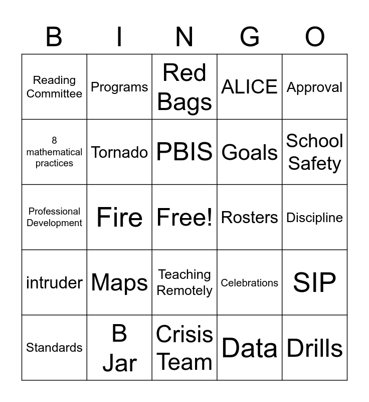 This bingo card has a free space and 24 words: Standards, Maps, PBIS, Data, Approval, Reading Committee, Programs, Red Bags, Rosters, Discipline, Professional Development, Tornado, Celebrations, SIP, 8 mathematical practices, B Jar, Crisis Team, ALICE, School Safety, intruder, Fire, Teaching Remotely, Goals and Drills.