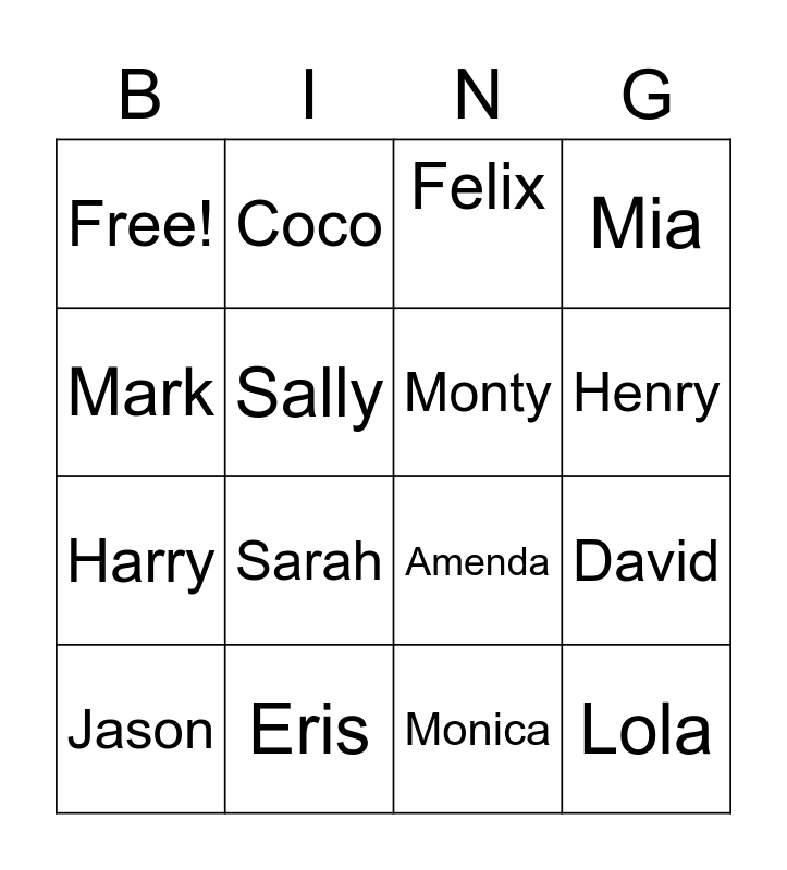 This bingo card has 16 words: Jason, Eris, Felix, Mia, Mark, Coco, Amenda, David, Free!, Sally, Monica, Henry, Harry, Sarah, Monty and Lola.