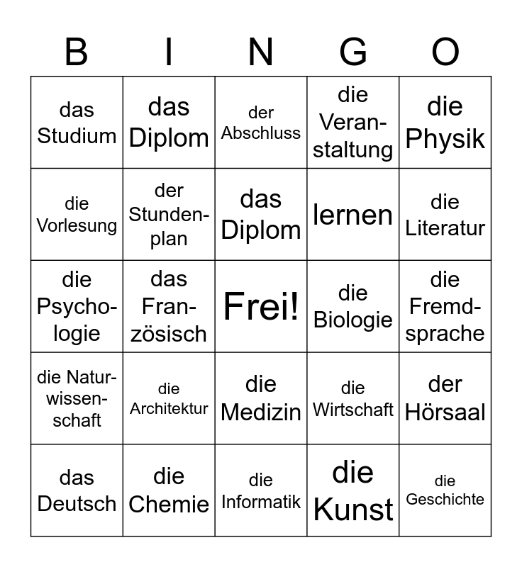 This bingo card has a free space and 29 words: das Deutsch, das Fach, das Fran-zösisch, das Spanisch, das Studium, der Abschluss, der Stunden-plan, die Architektur, die Biologie, die Chemie, die Fremd-sprache, die Geschichte, die Informatik, die Kunst, die Literatur, die Mathematik, die Medizin, die Natur-wissen-schaft, die Physik, die Psycho-logie, die Wirtschaft, studieren, lernen, die Vorlesung, die Veran-staltung, das Diplom, der Hörsaal, das Diplom and belegen.