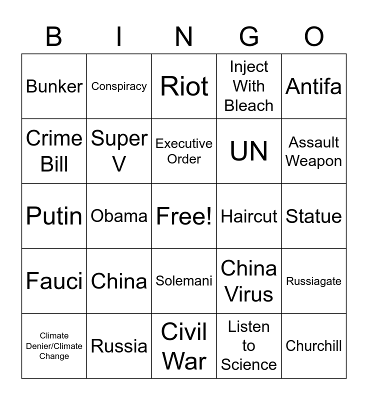 This bingo card has a free space and 34 words: Listen to the Experts, Listen to Science, Like You've Ever/Never Seen, Phase 3 Trials, Fauci, Super V, Antifa, Climate Denier/Climate Change, Conspiracy, Mask Mandate, Executive Order, Riot, Peaceful Protest, PPP, Haircut, Assault Weapon, Russia, Putin, China, China Virus, Solemani, Osama Bin Laden, Bunker, Statue, Civil War, Churchill, Inject With Bleach, WHO, UN, Crime Bill, Police, Obama, Russiagate and Hoax.