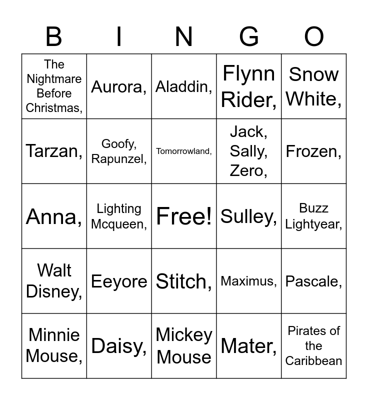 This bingo card has a free space and 48 words: Pocahontas, Pirates of the Caribbean, Cinderella, Mickey Mouse, Eeyore, Finding Nemo, Aurora,, Simba,, Tarzan,, The Little Mermaid,, Goofy, Rapunzel,, Flynn Rider,, Pascale,, Maximus,, Wreck-It Ralph,, 101 Dalmatians,, Tomorrowland,, Sulley,, Mike Wasoski,, Snow White,, Lighting Mcqueen,, Mater,, The Nightmare Before Christmas,, Jack, Sally, Zero,, The Matterhorn,, Frozen,, Minnie Mouse,, Lilo,, Stitch,, Walt Disney,, Dumbo,, Dory,, Maleficent,, Donald Duck,, Daisy,, Pluto,, Woody ,, Buzz Lightyear,, Forky,, Mulan,, Mushu,, Princess Jasmine,, Aladdin,, Elsa,, Anna,, Olaf,, Belle, and Princess Tiana,.