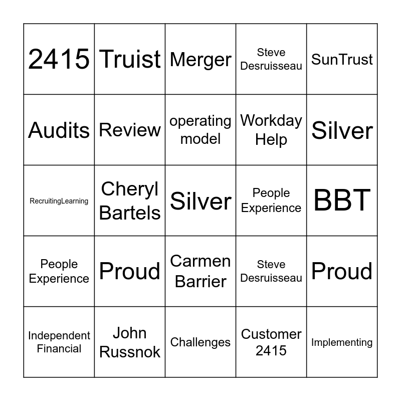 ⚠ This card has duplicate items: Silver (2), Truist (2), Independent Financial (2), Merger (2), BBT (2), SunTrust (2), John Russnok (2), Steve Desruisseau (2), People Experience (2), Carmen Barrier (2), Proud (2), ACV (2), Challenges (2), Cheryl Bartels (2), RecruitingLearning (2), VIBE (2)