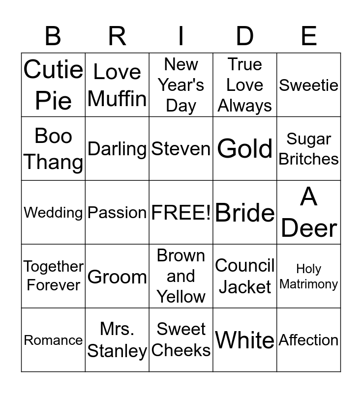 This bingo card has a free space and 26 words: Brown and Yellow, White, Steven, Mrs. Stanley, Sweetie, Cutie Pie, Boo Thang, Love Muffin, A Deer, Council Jacket, Gold, Wedding, Holy Matrimony, Romance, Passion, Brown Chicken Brown Cow, True Love Always, Together Forever, New Year's Day, Affection, Sugar Britches, Sweet Cheeks, Bride, Groom, Darling and Devotion.