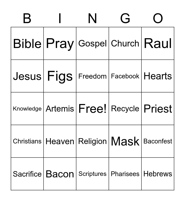 This bingo card has a free space and 27 words: Mask, Earth, Facebook, Scriptures, Jesus, Gospel, Pray, Christians, Recycle, Baconfest, Knowledge, Church, Sacrifice, Bacon, Hearts, Zeus, Figs, Freedom, Heaven, Bible, Priest, Pharisees, Artemis, Hebrews, Religion, Raul and Father’s Day.