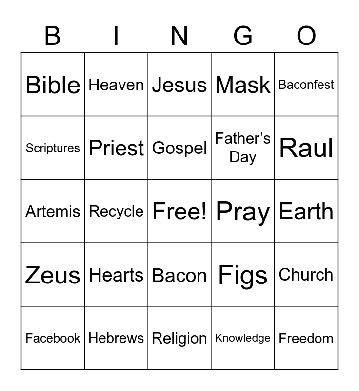 This bingo card has a free space and 27 words: Figs, Sacrifice, Father’s Day, Religion, Scriptures, Jesus, Heaven, Zeus, Pray, Church, Artemis, Mask, Facebook, Hebrews, Raul, Pharisees, Priest, Gospel, Hearts, Bible, Earth, Knowledge, Recycle, Freedom, Bacon, Baconfest and Christians.