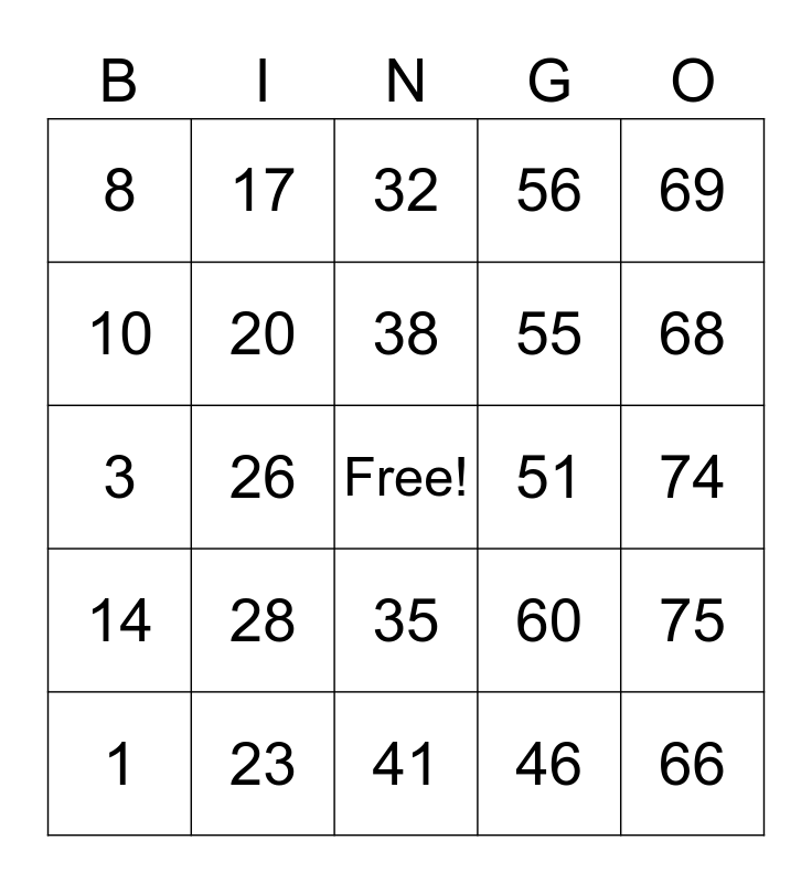 This bingo card has a free space and 24 words: 1, 28, 38, 46, 69, 8, 17, 32, 51, 74, 3, 20, 60, 75, 10, 23, 41, 56, 68, 14, 26, 35, 55 and 66.