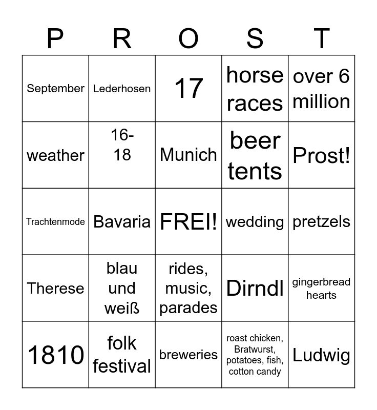 This bingo card has a free space and 24 words: blau und weiß, folk festival, Munich, 1810, over 6 million, September, weather, Lederhosen, wedding, rides, music, parades, beer tents, Trachtenmode, Dirndl, gingerbread hearts, 16-18, roast chicken, Bratwurst, potatoes, fish, cotton candy, pretzels, 17, Prost!, Bavaria, Ludwig, Therese, horse races and breweries.