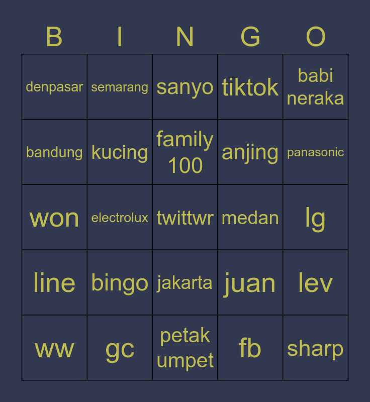 This bingo card has 25 words: bingo, petak umpet, family 100, ww, babi neraka, denpasar, bandung, semarang, medan, jakarta, anjing, won, juan, lev, kucing, sharp, lg, sanyo, panasonic, electrolux, twittwr, gc, line, tiktok and fb.