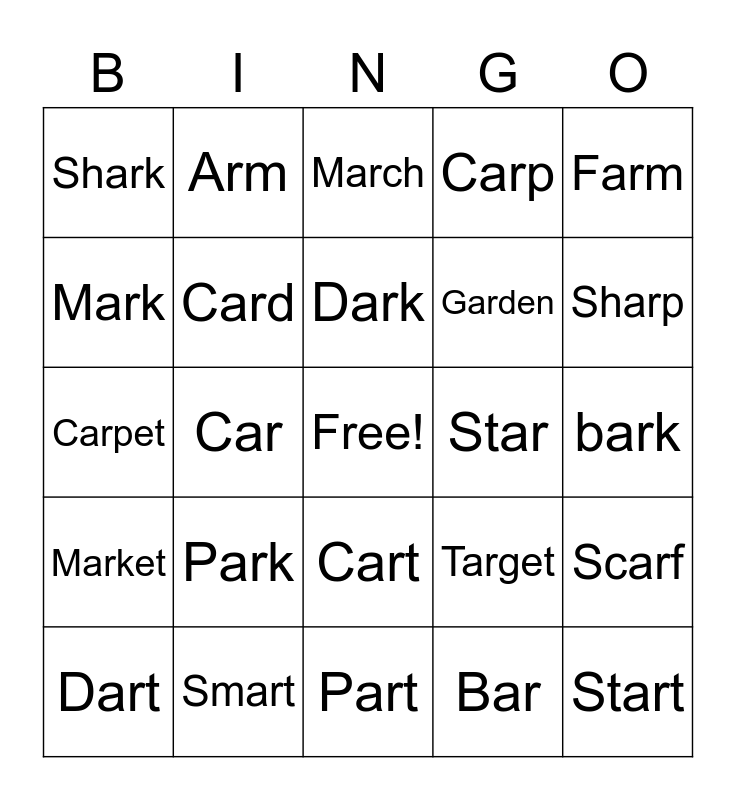 This bingo card has a free space and 24 words: Park, Smart, Dark, Dart, Farm, Shark, Mark, Arm, Star, Cart, Garden, Carpet, Target, Scarf, Card, Bar, bark, March, Sharp, Car, Start, Market, Carp and Part.