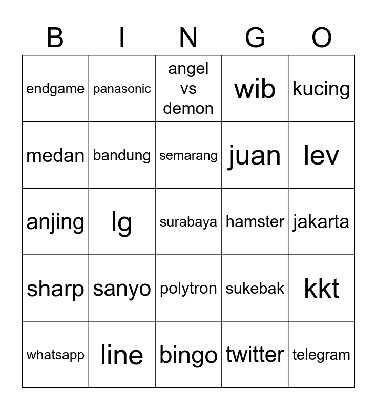 This bingo card has 25 words: sanyo, bingo, semarang, whatsapp, kucing, endgame, medan, panasonic, hamster, polytron, juan, anjing, sukebak, kkt, bandung, telegram, jakarta, angel vs demon, lev, lg, surabaya, line, sharp, wib and twitter.