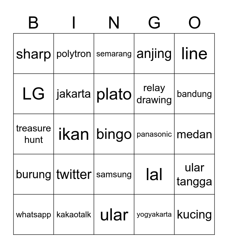 This bingo card has a free space and 24 words: twitter, kakaotalk, plato, whatsapp, line, sharp, LG, polytron, panasonic, samsung, relay drawing, treasure hunt, lal, ular tangga, jakarta, yogyakarta, medan, semarang, bandung, ikan, kucing, burung, anjing and ular.