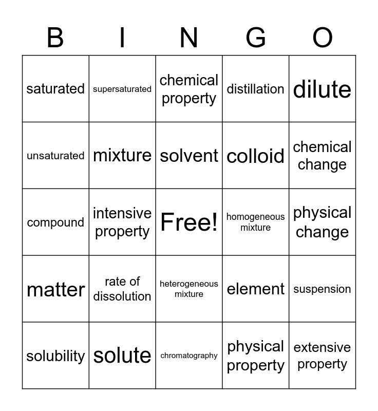 This bingo card has a free space and 24 words: rate of dissolution, solute, solvent, solubility, dilute, saturated, unsaturated, supersaturated, homogeneous mixture, heterogeneous mixture, colloid, compound, element, suspension, mixture, physical property, physical change, chemical property, chemical change, intensive property, extensive property, matter, distillation and chromatography.