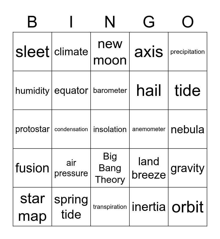 This bingo card has 52 words: Free!, insolation, atmosphere, transpiration, air pressure, altitude, climate, volume, humidity, greenhouse effect, equator, troposphere, gravity, land breeze, sea breeze, elliptical, barometer, anemometer, rotation, precipitation, condensation, inertia, sleet, hail, revolution, orbit, weather, latitude, tide, lunar eclipse, seasons, axis, waxing, waning, full moon, new moon, spring tide, neap tide, solar eclipse, solar system, satellite, nebula, fusion, constellation, Big Bang Theory, asteroid, meteor, protostar, red giant, white dwarf, star map and apparent motion.