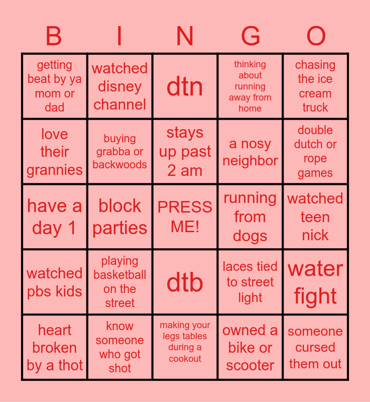 This bingo card has a free space and 24 words: playing basketball on the street, know someone who got shot, stays up past 2 am, heart broken by a thot, chasing the ice cream truck, getting beat by ya mom or dad, love their grannies, watched disney channel, running from dogs, dtb, a nosy neighbor, have a day 1, laces tied to street light, water fight, buying grabba or backwoods, owned a bike or scooter, watched teen nick, dtn, double dutch or rope games, block parties, someone cursed them out, watched pbs kids, thinking about running away from home and making your legs tables during a cookout.