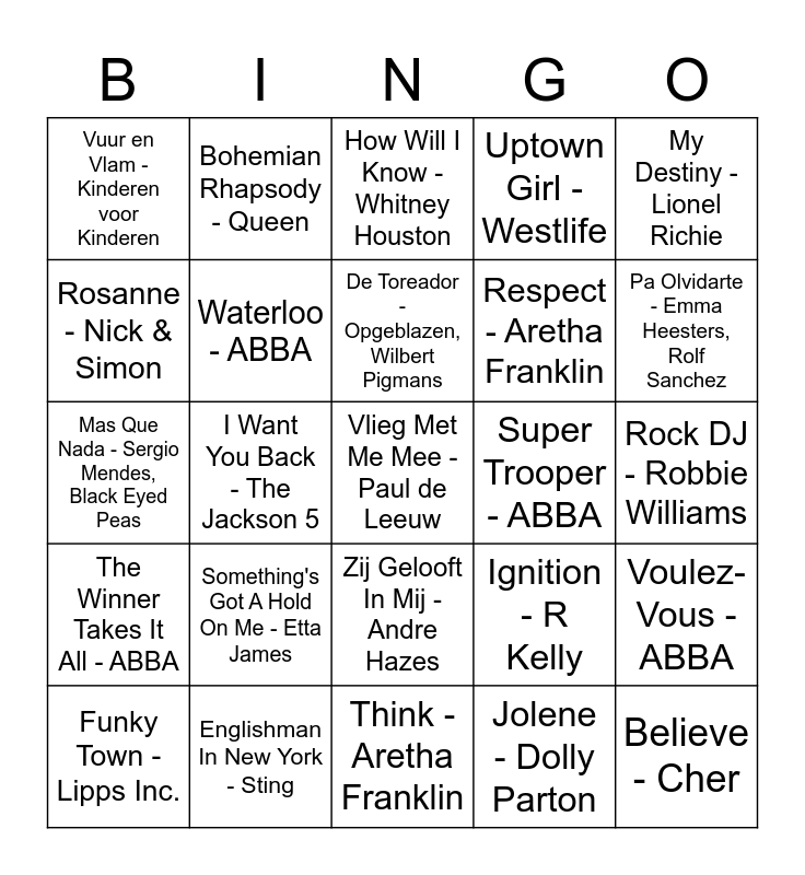 This bingo card has 37 words: Free!, Boogie Wonderland - Earth, Wind & Fire, Hot Stuff - Donna Summer, Waterloo - ABBA, Voulez-Vous - ABBA, Something's Got A Hold On Me - Etta James, De Toreador - Opgeblazen, Wilbert Pigmans, De Snaren van m'n hart - Ruth Jacott, My Destiny - Lionel Richie, Breathe - Blu Cantrell, Sean Paul, I Want You Back - The Jackson 5, Uptown Girl - Westlife, Vlieg Met Me Mee - Paul de Leeuw, Rock DJ - Robbie Williams, Rosanne - Nick & Simon, The Winner Takes It All - ABBA, Brabant - Guus Meeuwis, How Will I Know - Whitney Houston, Zij Gelooft In Mij - Andre Hazes, Super Trooper - ABBA, Vuur en Vlam - Kinderen voor Kinderen, Pa Olvidarte - Emma Heesters, Rolf Sanchez, Funky Town - Lipps Inc., Think - Aretha Franklin, Dancing Queen - ABBA, Jolene - Dolly Parton, Bohemian Rhapsody - Queen, Let It Be - The Beatles, YMCA - Village People, I Want You Back - The Jackson 5, Material Girl - Madonna, Englishman In New York - Sting, Mas Que Nada - Sergio Mendes, Black Eyed Peas, Believe - Cher, Ignition - R Kelly, Respect - Aretha Franklin and Back For Good - Take That.