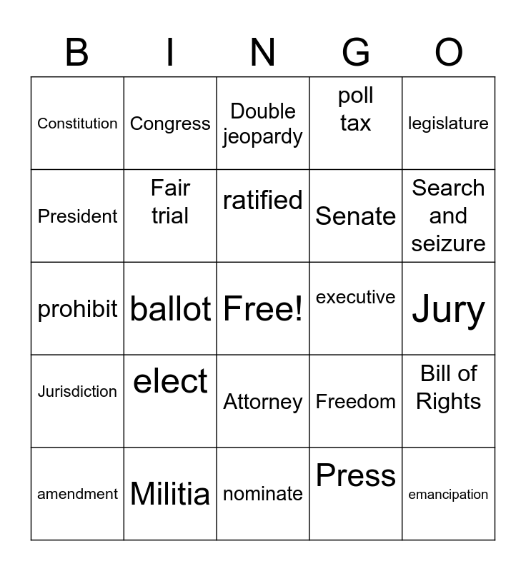 This bingo card has a free space and 24 words: elect, Militia, ratified, amendment, legislature, Constitution, President, Congress, executive, Attorney, Senate, prohibit, Freedom, Bill of Rights, Fair trial, Press, Jury, Double jeopardy, Search and seizure, ballot, emancipation, Jurisdiction, poll tax and nominate.