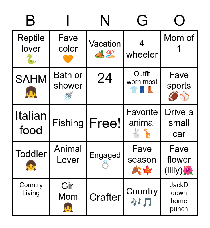 This bingo card has a free space and 24 words: Animal Lover, Girl Mom π§, 24, Country Living, Mom of 1, Reptile lover π, SAHM π§, Fave color π§‘, Favorite animal ππ¦, Engaged π, Outfit worn most πππ’, Italian food, Fave seasonππ, Fave flower (lilly)πΊ, Bath or showerπΏ, Country πΆπ΅, Drive a small car, Vacationππ, Fave sportsπβΎ, Fishing, JackD down home punch, Toddlerπ§, 4 wheeler and Crafter.