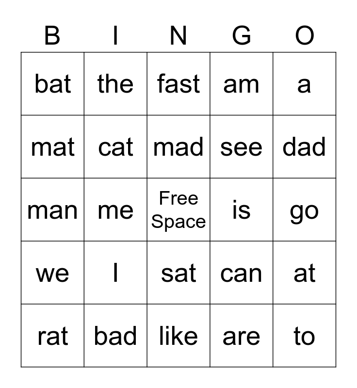 This bingo card has a free space and 24 words: I, bad, mad, rat, a, bat, mat, the, is, sat, see, man, can, at, cat, are, go, fast, dad, me, to, we, am and like.